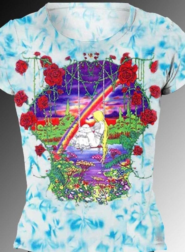 The “Girl on a Swing” women’s fantasy art t-shirt is very delicate scene of a beautiful girl sitting on a swing overlooking a lake with trees in the background and a rainbow dropping into the middle of the lake. The Girl on a Swing surrounded by Roses and is ornamented with various other flowers and plant life along the shoreline. This is one of my favorite fantasy art pieces and I hope you like it too.