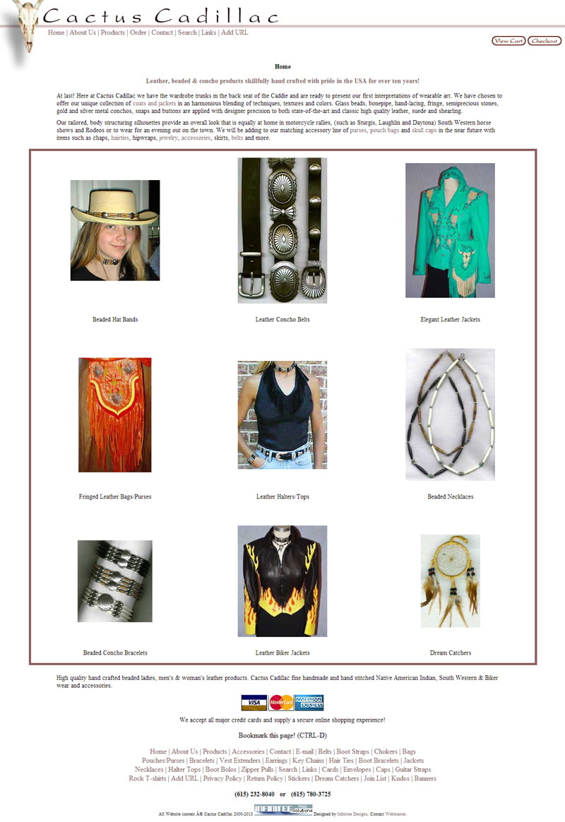 Cactus Cadillac eCommerce Website – High quality hand crafted fringed & beaded ladies, men’s & woman’s leather products, apparel, accessories, jewelry and clothing. Cactus Cadillac fine handmade and hand stitched Native American Indian, South Western & Biker wear and accessories. These fine handmade products can be found at Cactus Mountain Designs.
