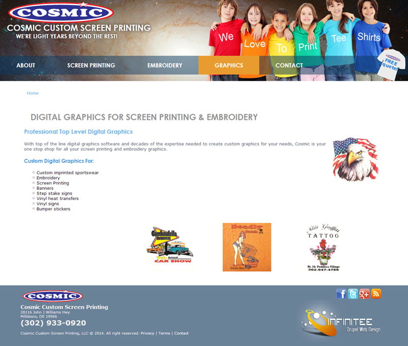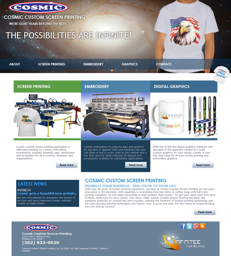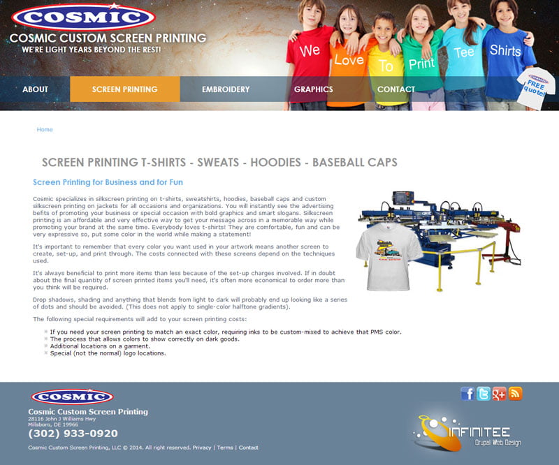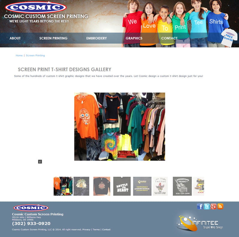 With over 40 years of screen-printing experience, we here at Cosmic Custom Screen Printing are the most innovative in the business. With expertise in everything from tee shirts to coffee mugs with full-color printing capability, no one takes more pride in their product than Cosmic. To get your name seen from here to Mars, make sure it’s on a Cosmic Tee! Since 1988, Cosmic Custom Screen Printing has been the complete authority on custom tee shirt creation. Utilizing the forefront of screen-printing technology and full-color process printing techniques, the Cosmic crew is up to any task. For the future of screen printing, you can only go Cosmic!Cosmic Printing Milllsboro, Delaware for your silk screen printing and embroidery needs, full-color printing of t-shirts to coffee mugs.The website was built on the Drupal CMS platform with PHP, HTML, XHTML & Java Script., blog, galleries and custom views. Custom templates and modules, CSS, search engine optimization (SEO), programming and custom graphics. Loaded with client side page creation and editing, image and media uploading, editing and input capabilities. Web design, programming, MySQL databases and graphics by Infinitee Web Design.